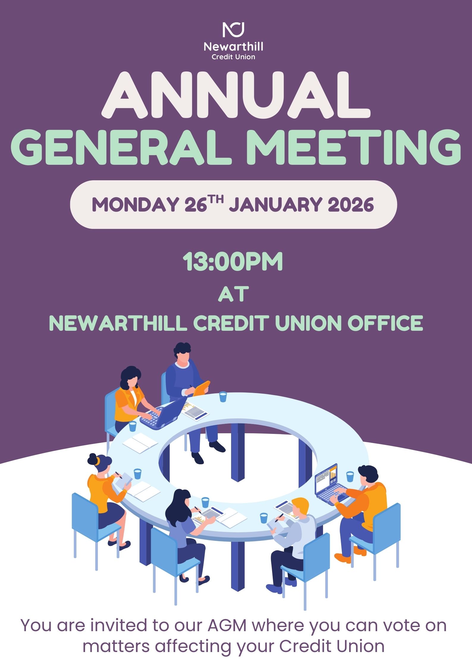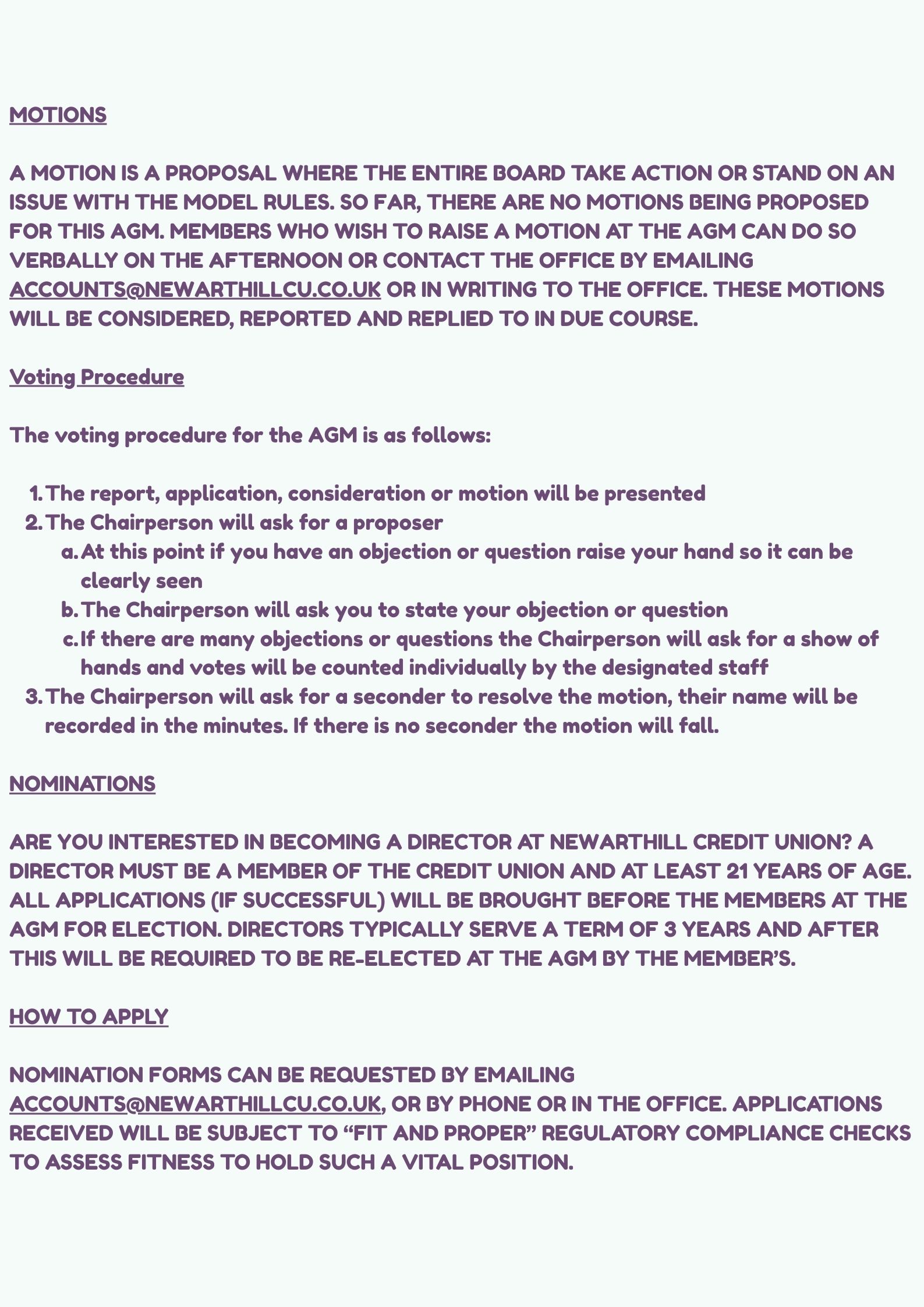 A motion is a proposal where the entire board take action or stand on an issue with the Model Rules. So far, there are no motions being proposed for this AGM. Members who wish to raise a motion at the AGM can do so verbally on the afternoon or contact the office by emailing accounts@newarthillcu.co.uk or in writing to the office. These motions will be considered, reported and replied to in due course.